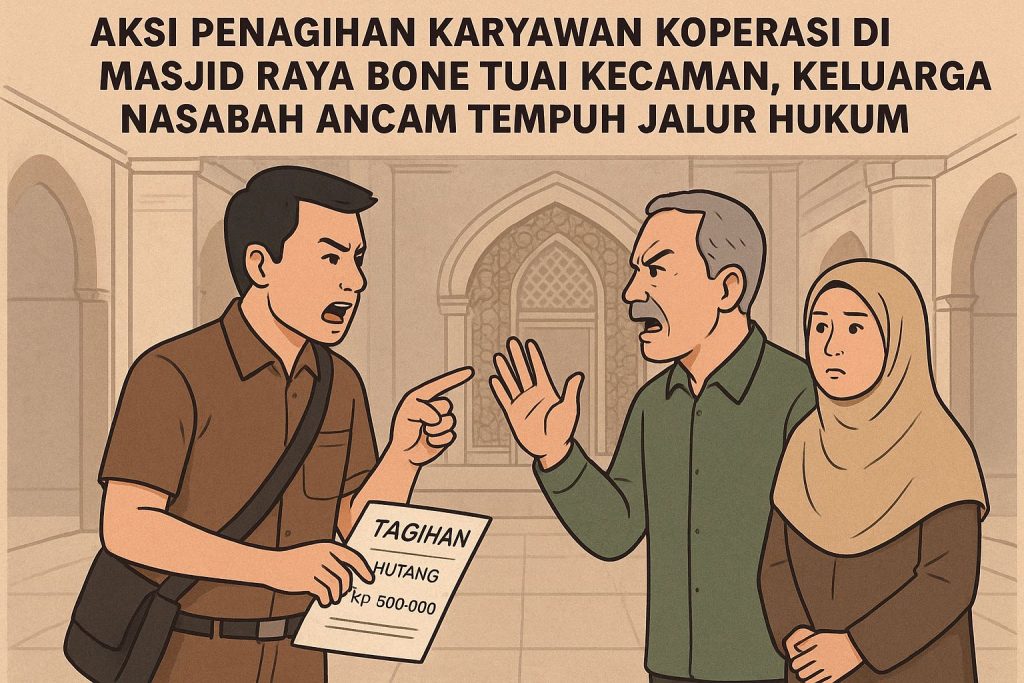 Bone — Sebuah video memperlihatkan dua pria menagih seorang nasabah di halaman Masjid Raya Jalan Masago, Bone, mendadak viral di media sosial pada Jumat (24/10/2025). Aksi itu langsung memicu gelombang kecaman dari berbagai kalangan.