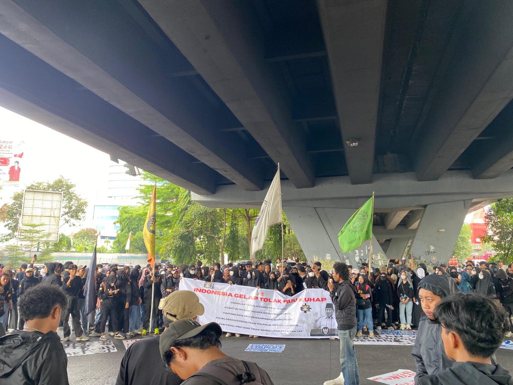 Makassar – Mahasiswa Universitas Negeri Makassar (UNM) menggelar demonstrasi menolak RUU KUHAP di Flyover Pettarani, Makassar, Selasa (5/8/2025). Aksi ini menyoroti proses legislasi Rancangan Undang-Undang tentang Kitab Undang-Undang Hukum Acara Pidana (RUU KUHAP) yang berjalan secara tertutup, tergesa-gesa, dan tanpa partisipasi publik yang bermakna.
