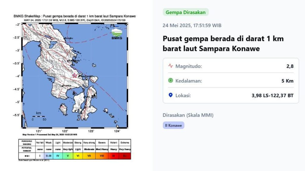 Jakarta – 24 Mei 2025, Badan Meteorologi, Klimatologi, dan Geofisika (BMKG) mencatat lima kali gempa bumi yang mengguncang beberapa wilayah di Indonesia sepanjang Sabtu (24/5). Meski intensitas gempa bervariasi dan tidak menimbulkan korban jiwa maupun kerusakan berarti, masyarakat diimbau untuk tetap waspada dan mengikuti arahan dari pihak berwenang.