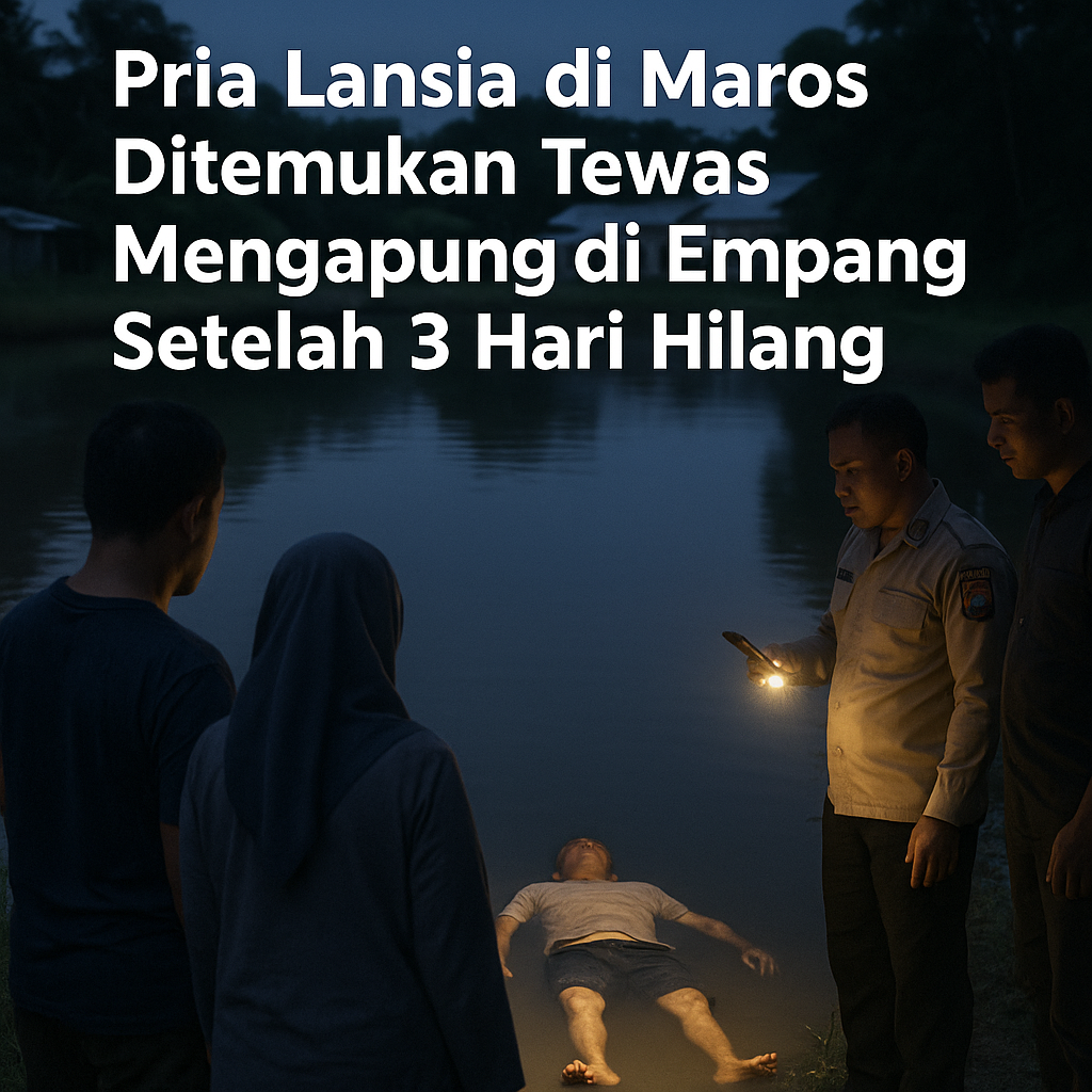 Maros — Seorang pria lanjut usia berinisial HR (67), warga Kelurahan Adatongeng, Kecamatan Turikale, Kabupaten Maros, ditemukan tewas mengapung di empang milik warga pada Minggu malam (15/6). Sebelumnya, korban dilaporkan hilang selama tiga hari oleh pihak keluarga.